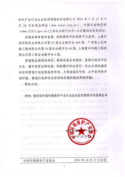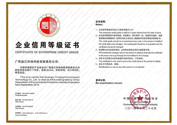 经中国环境保护产业协会信用评价办公室和信用评价专家委员会严格评价,并通过协会信用评价工作委员会审核、商务部备案,广西博亚体育在线官网科技有限责任公司被评为中国环境保护产业行业企业信用等级评价AAA级企业(最高一级),公司已于12月8日领取证书。