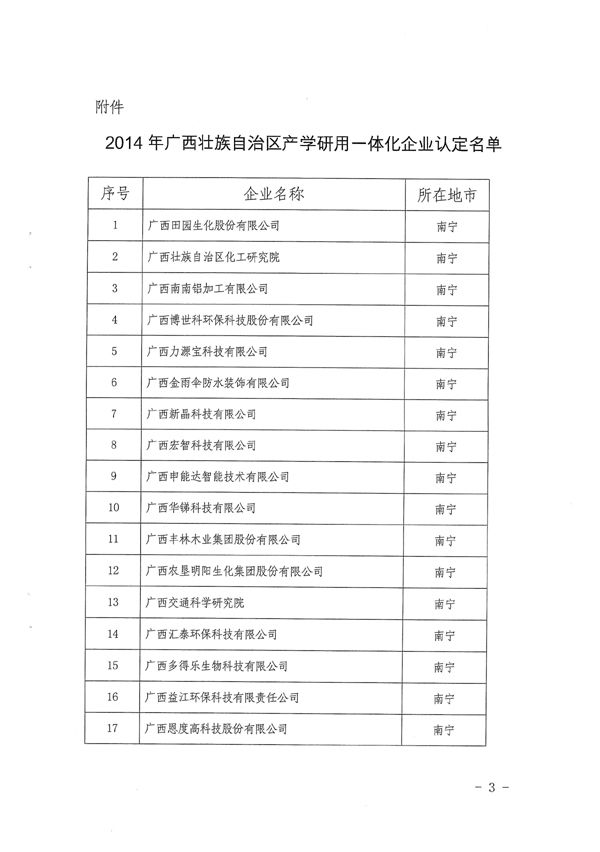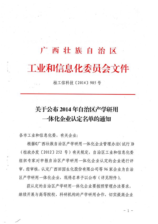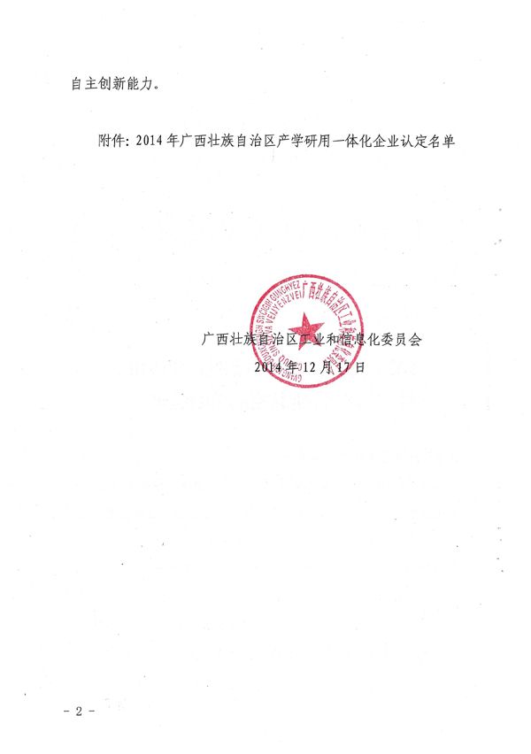 12月19日,广西壮族自治区工业和信息化委会公布了2014年自治区产学研用一体化企业名单,其中广西博亚体育在线官网科技有限责任公司等96家企业获得认定。