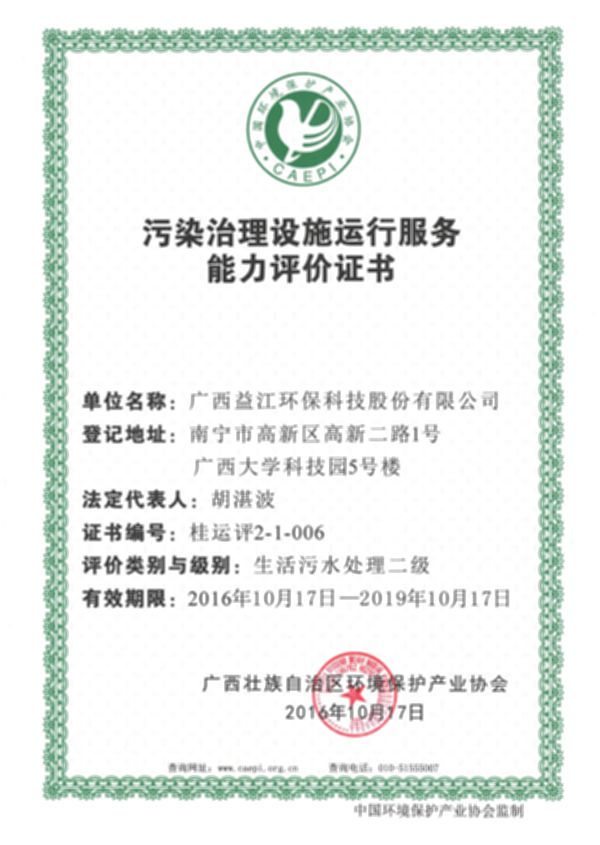 10月17日,经广西环境保护产业协会审核、中国环境保护产业协会批准,博亚体育在线官网获得环境污染治理设施运行服务能力“生活污水处理二级”证书。这标志着公司的生活污水设施运行服务能力获得行业认可,公司的综合实力和竞争力进一步提高,为今后业务拓展奠定了坚实的基础。