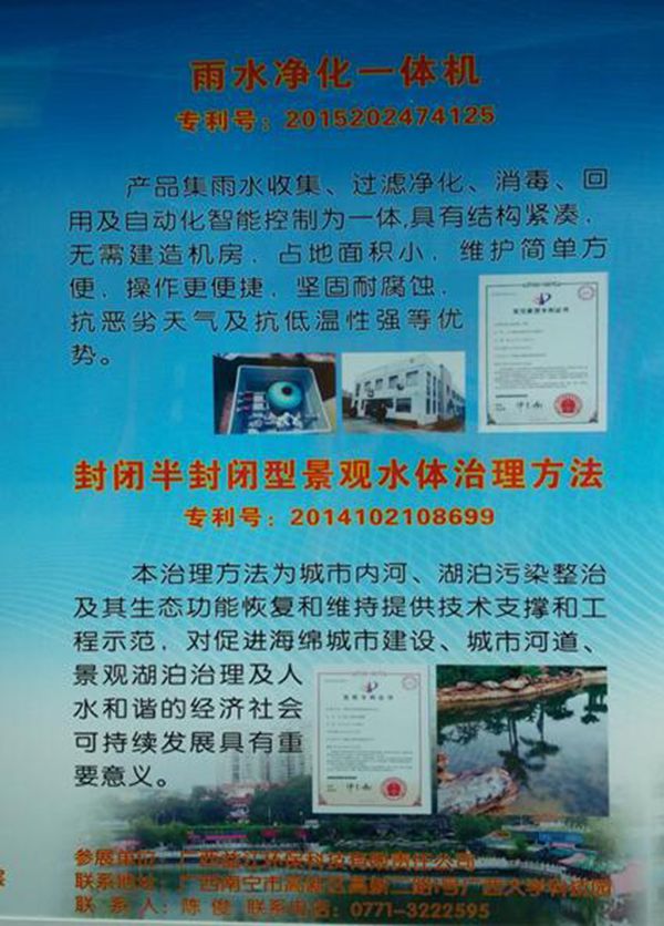 此届展会上,公司携“雨水净化一体机(专利号:20152024712.5)”“封闭半封闭型景观水体治理方法(专利号:2014102108699)”两项海绵城市雨水治理发明专利参展,通过模型沙盘及宣传资料,展示了近年来在流域治理及海绵城市建设中取得的成果。展会期间,公司的“雨水净化一体机”专利产品及景观水体治理方法得到政府、业内同行的认可,公司形象生动的沙盘模型吸引了众多市民的驻足观看,公司技术人员现场解说、普及海绵城市知识,为市民、学生上了一堂生动的环保知识课程,反响热烈。