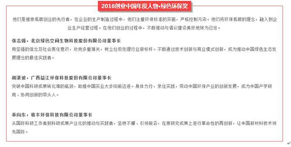 博亚体育在线官网董事长胡湛波获2016年创业中国年度人物“绿色环保奖”