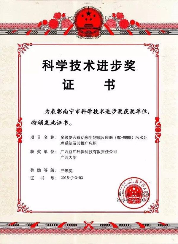 1、2016年1月,公司“多级复合移动床生物膜反应器(MC-MBBR)污水处理系统及其推广应用”荣获南宁市科学技术进步奖三等奖。
