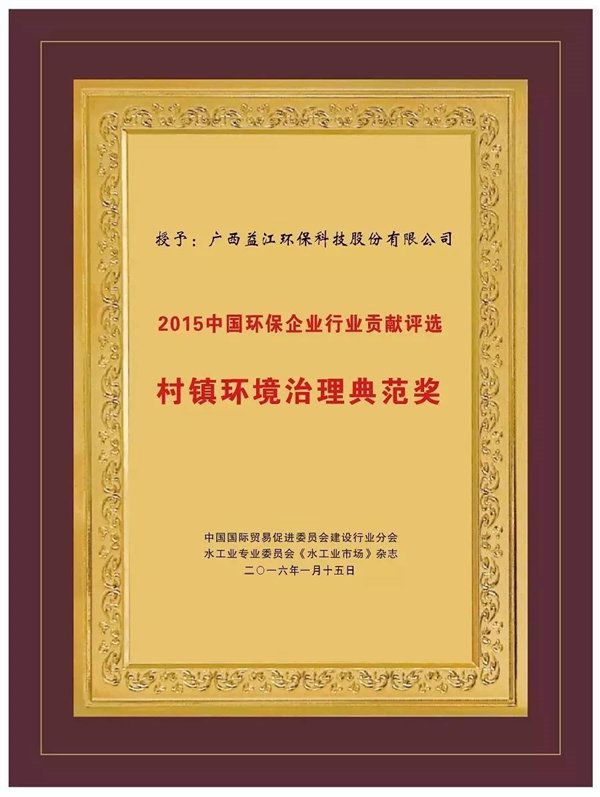 2、2016年1月,“2015中国环保企业行业贡献评选” 结果揭晓,公司凭借自主研发的多项村镇生活污水处理技术,为广西“十二五”乡镇污水处理提供了强有力的技术支撑,荣获2015中国环保企业行业“村镇环境治理典范奖”。