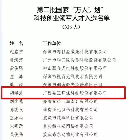 4、2016年7月,胡湛波董事长继2014年入选国家科技部创新人才推进计划“科技创新创业人才”后,成功入选第二批国家“万人计划”科技创业领军人才,是目前广西唯一入选的科技创业领军人才。