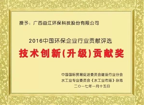 由中国国际贸易促进委员会建设行业分会和水工业专业委员会《水工业市场》杂志共同主办的“2016中国环保企业行业贡献评选”活动于2017年1月15日揭晓评选结果,博亚体育在线官网被授予“技术创新(升级)贡献奖”荣誉称号。公司先进的环保技术、高科技的研发产品、优秀的应用案例和宝贵的实践管理经验,不仅为中国环保产业发展注入新的活力,同时也在广西环保行业产业当中进一步树立了标杆地位。