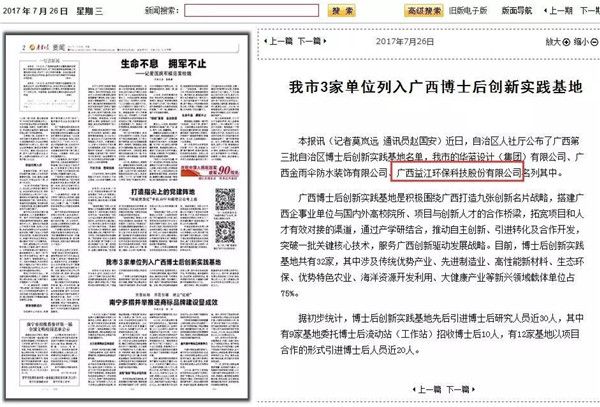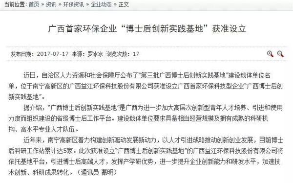 7月17日,广西环保产业网以《广西首家环保企业“博士后创新实践基地”获准设立》为题,发布了博亚体育在线官网入选基地的新闻通讯。