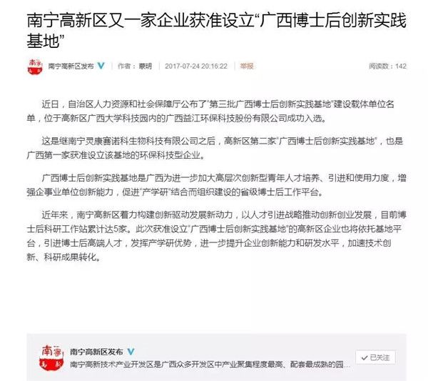 7月24日,南宁高新技术产业开发区官方微博“南宁高新区发布”以《南宁高新区又一家企业获准设立“广西博士后创新实践基地”》为题,发布了博亚体育在线官网入选基地的新闻通讯。