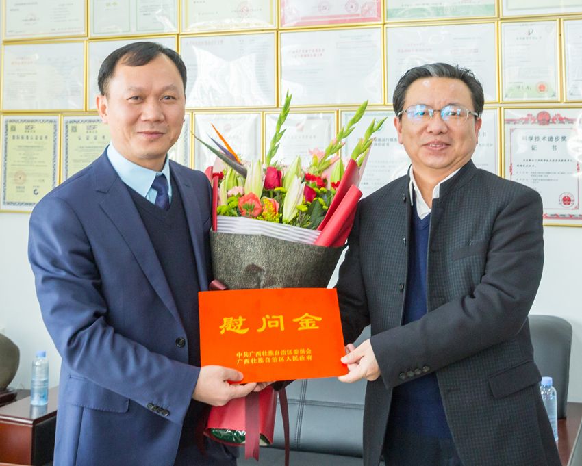2月9日下午,自治区人大常委会副主任卢献匾在广西大学副校长、南宁市人大常委会副主任钱健的陪同下莅临广西大学科技园,代表自治区领导对国家“万人计划”科技创业领军人才、广西大学资源环境与材料学院教授、博亚体育在线官网董事长胡湛波致以亲切的问候和新春祝福。